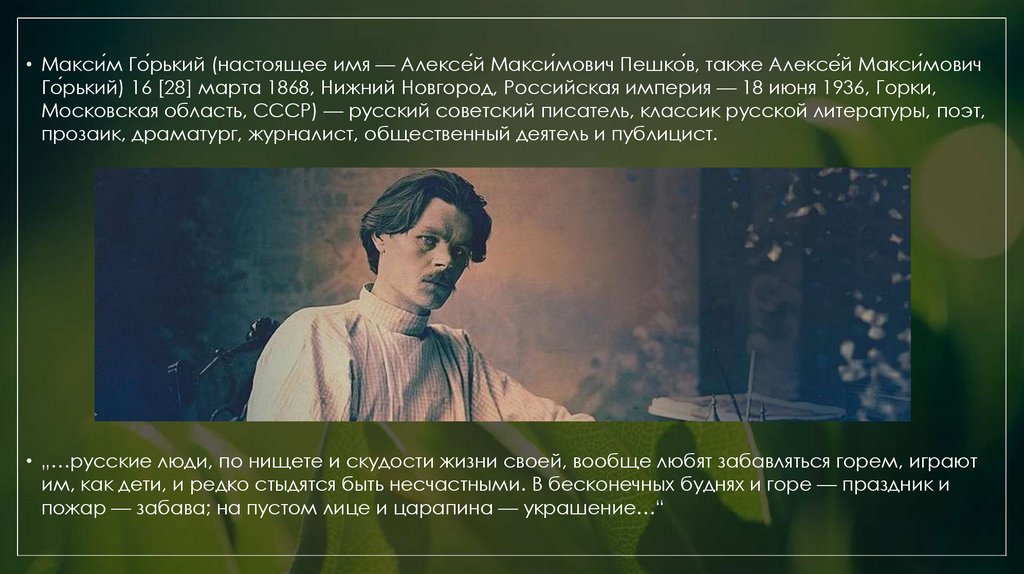 • Макси́м Го́рький (настоящее имя — Алексе́й Макси́мович Пешко́в, также Алексе́й Макси́мовичГо́рький) 16 [28] марта 1868, Нижний Новгород, Российская империя — 18 июня 1936, Горки,