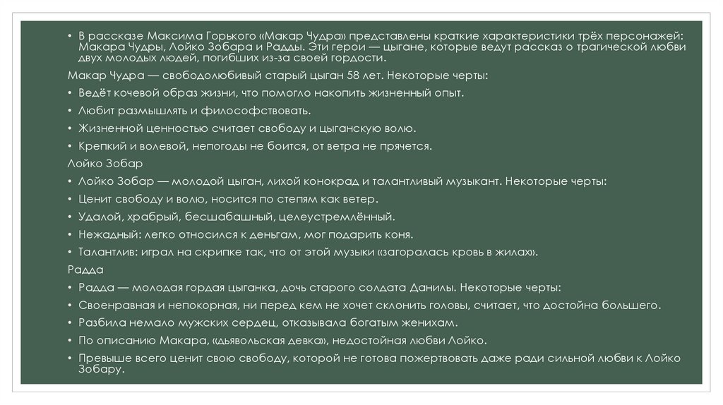любви. Образ Макара Чудры — собирательный: это мудрый старик, носитель философии свободы, которую Горький