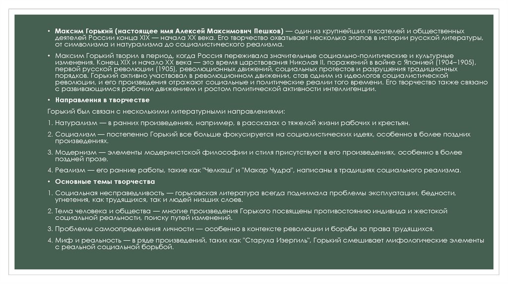 • Максим Горький творил в период, когда Россия переживала значительные социально-политические и культурные
