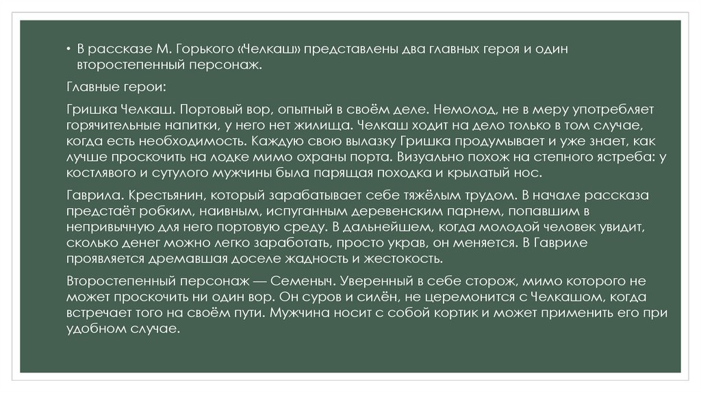 его образе много романтического обаяния. Контрастные персонажи: свободный, но опасный Челкаш ↔