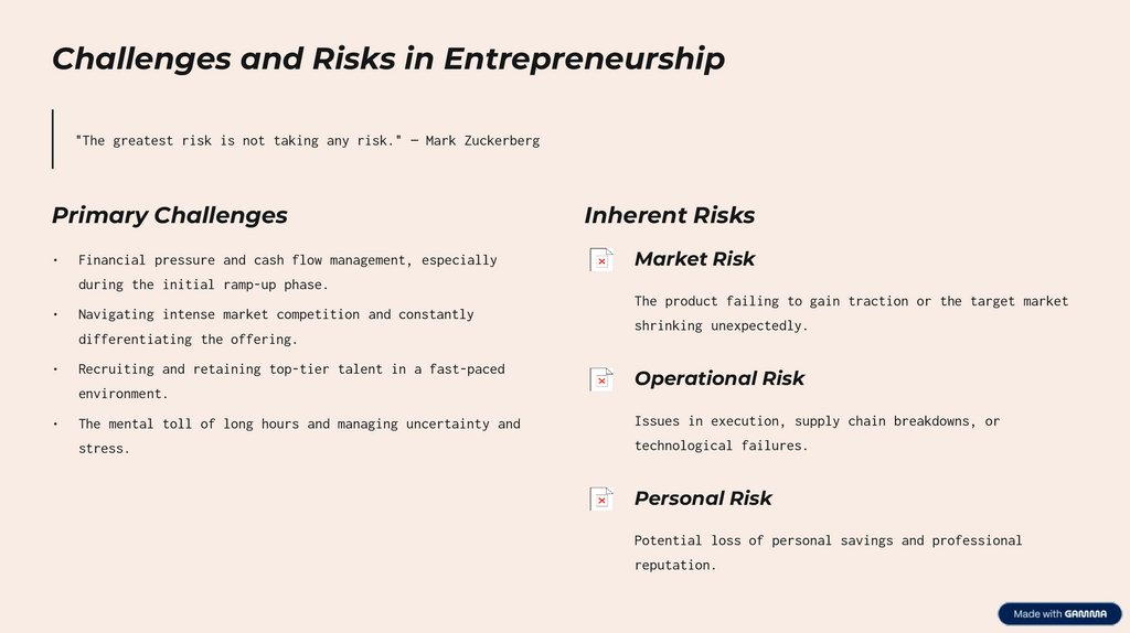 Challenges and Risks in Entrepreneurship"The greatest risk is not taking any risk." — Mark Zuckerberg
