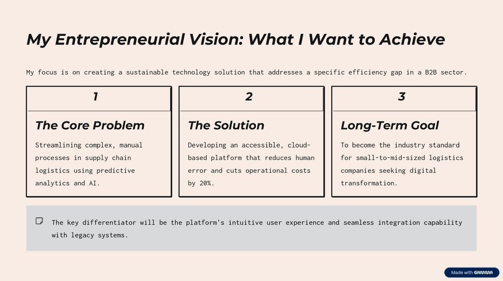 My Entrepreneurial Vision: What I Want to AchieveMy focus is on creating a sustainable technology solution that addresses a specific efficiency gap in a B2B sector.