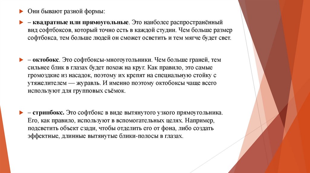 Софтбокс — это общее название для несколькихвидов насадок. Они представляют собой мягкие