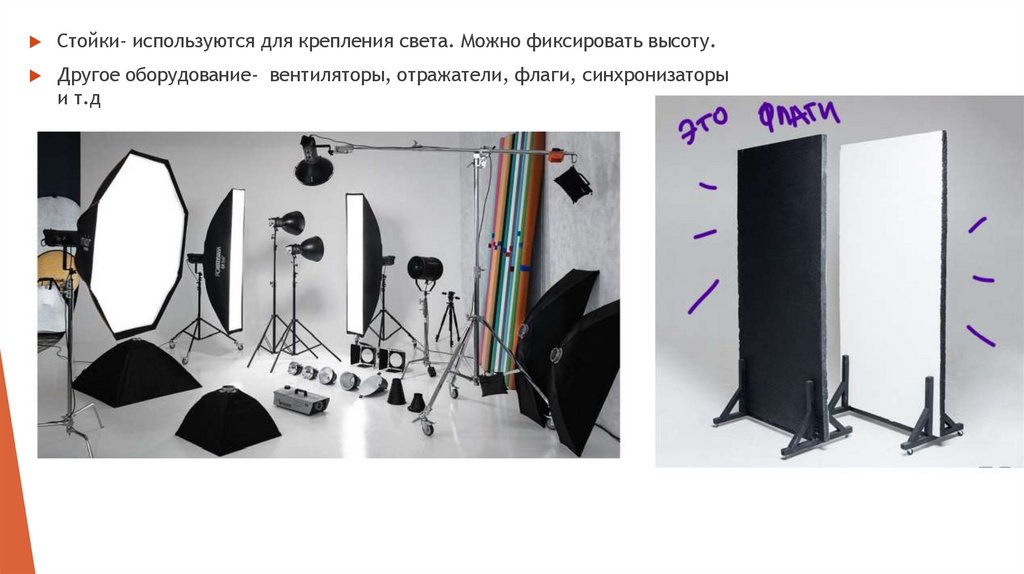 Стойки- используются для крепления света. Можно фиксировать высоту.Другое оборудование- вентиляторы, отражатели, флаги, синхронизаторы