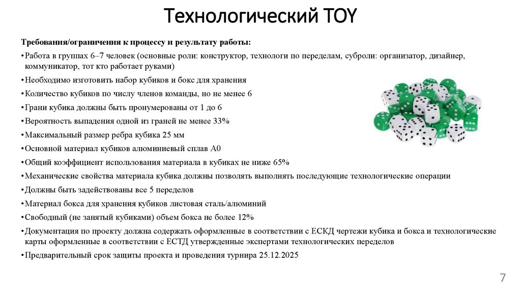 • Работа в группах 6–7 человек (основные роли: конструктор, технологи по переделам, суброли: организатор, дизайнер,