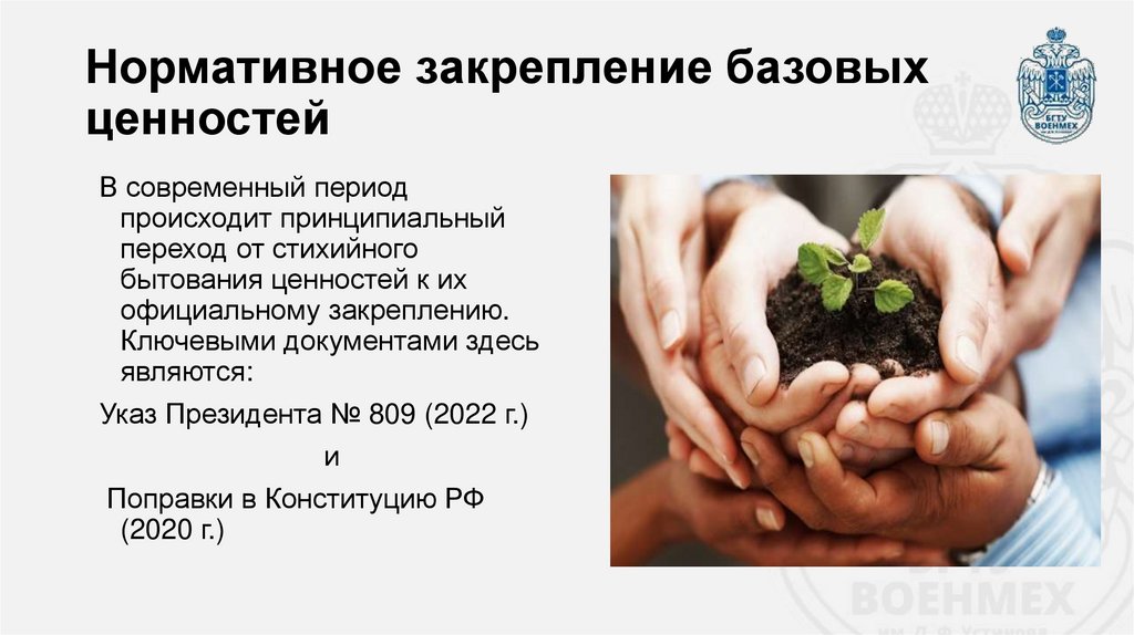 В современный период происходит нормативное закрепление традиционных ценностей, что