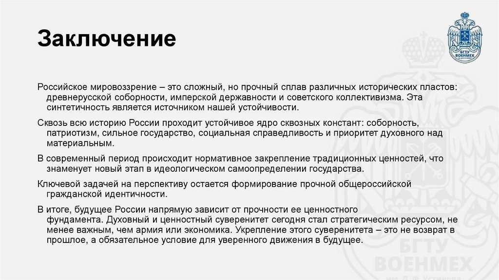 ЗаключениеРоссийское мировоззрение – это сложный, но прочный сплав различных исторических пластов: