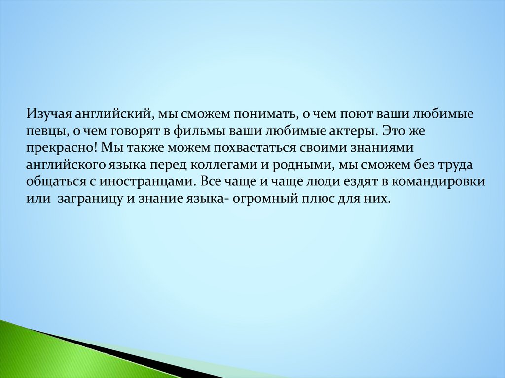 Изучая английский, мы сможем понимать, о чем поют ваши любимыепевцы, о чем говорят в фильмы ваши любимые актеры. Это же