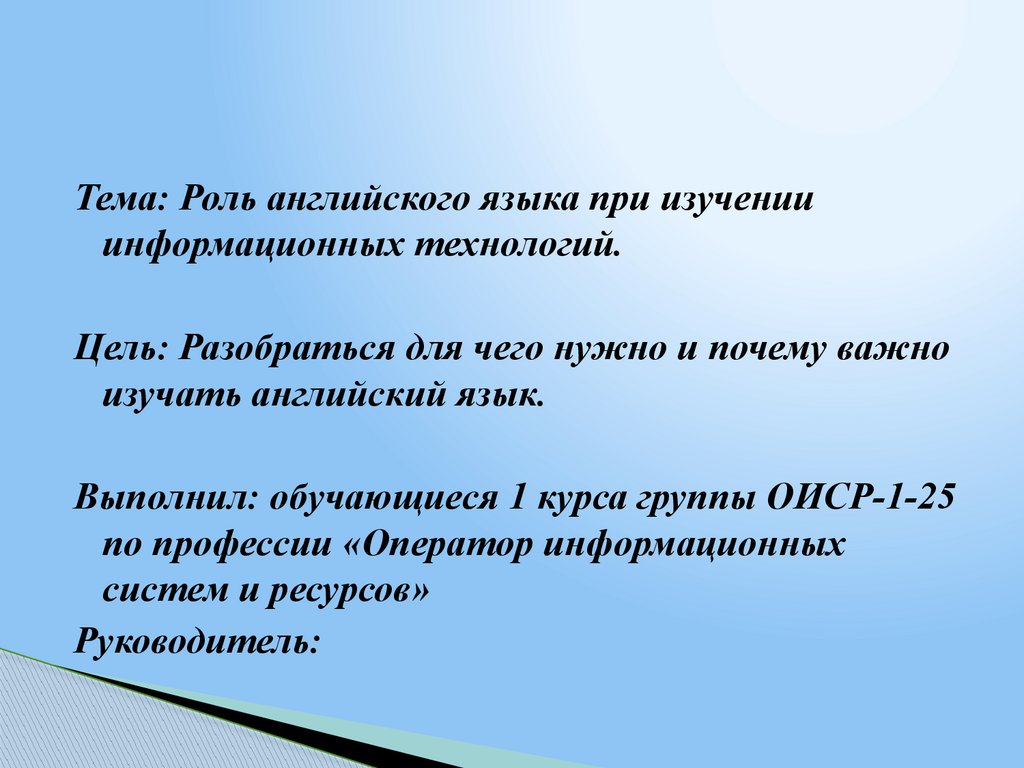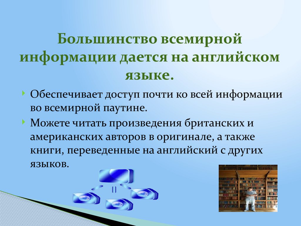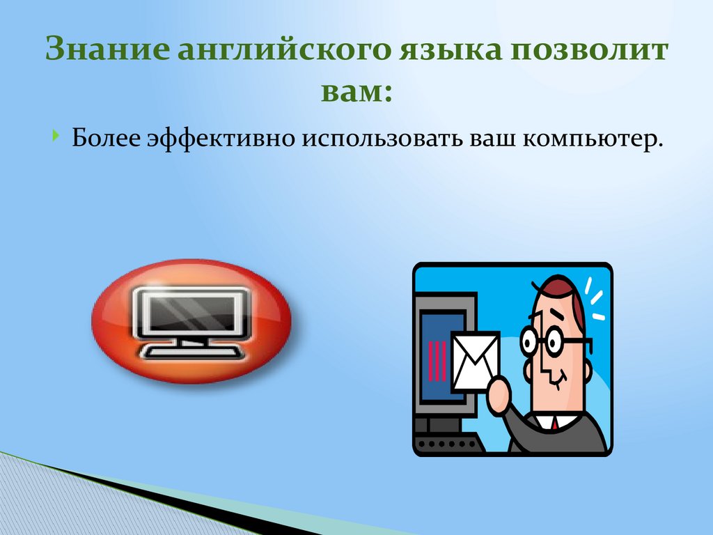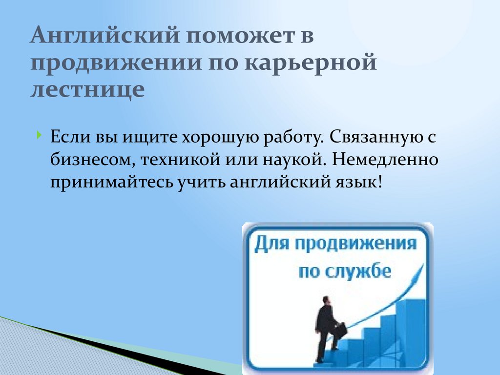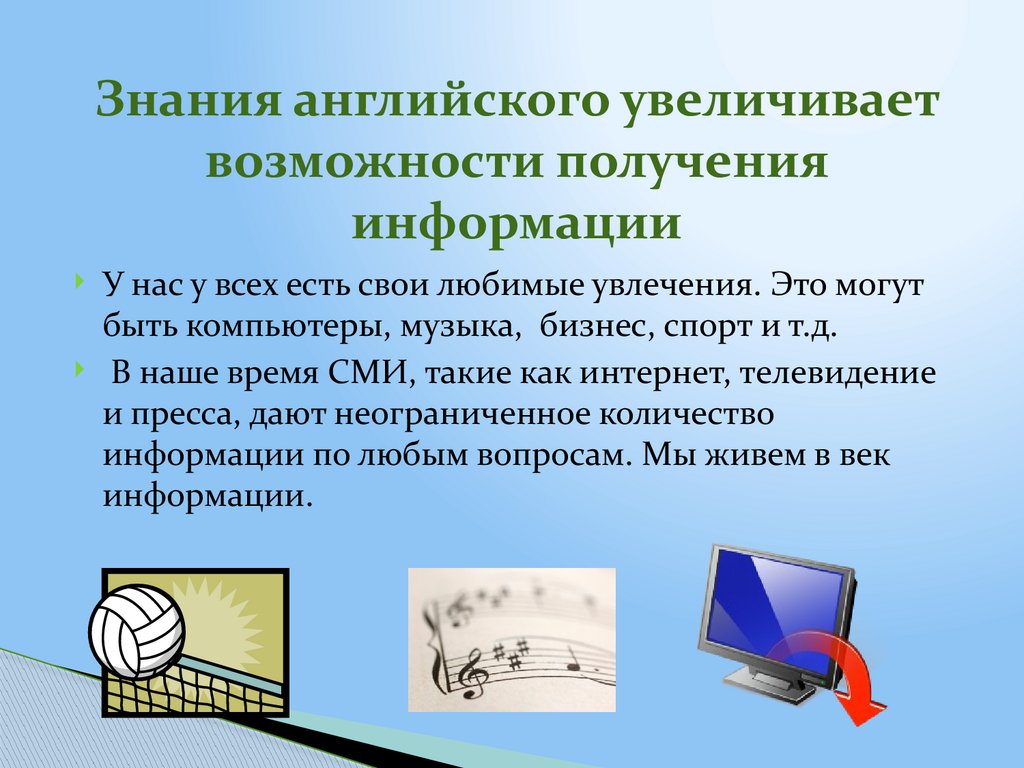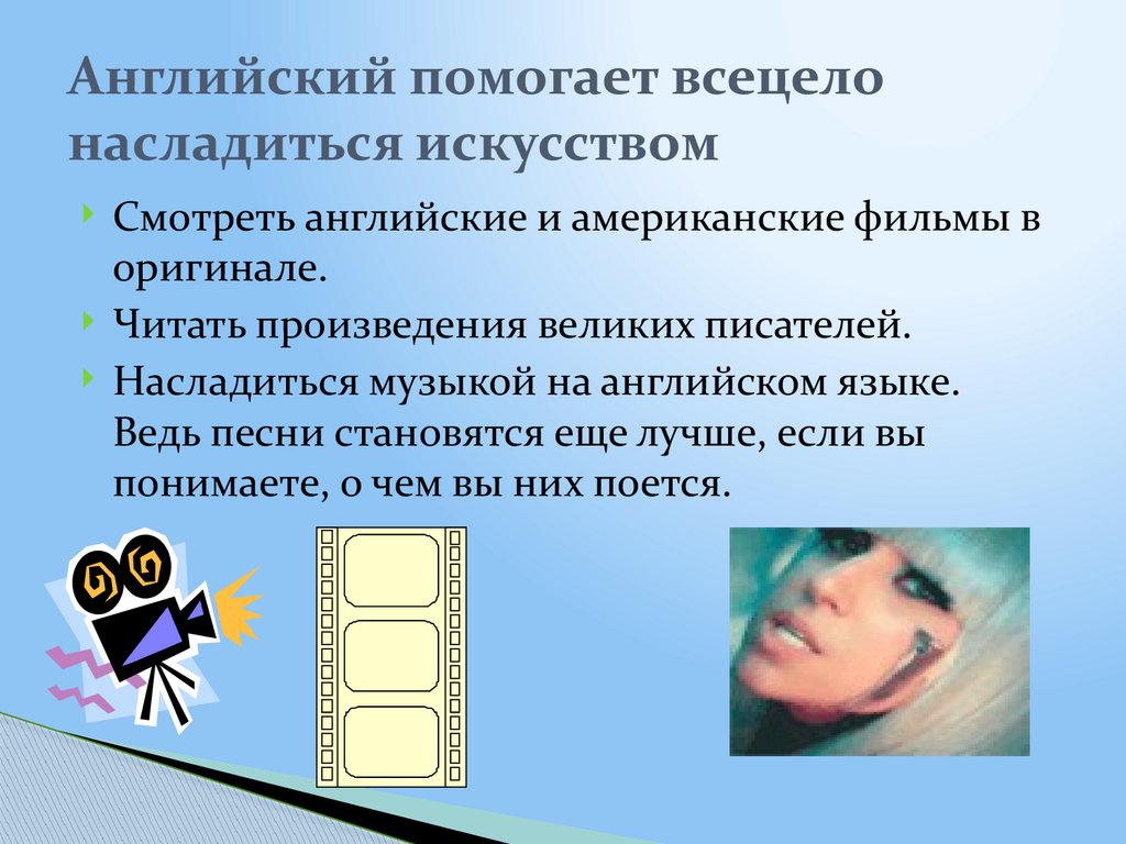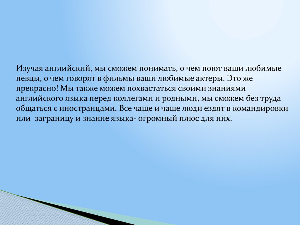Изучая английский, мы сможем понимать, о чем поют ваши любимыепевцы, о чем говорят в фильмы ваши любимые актеры. Это же