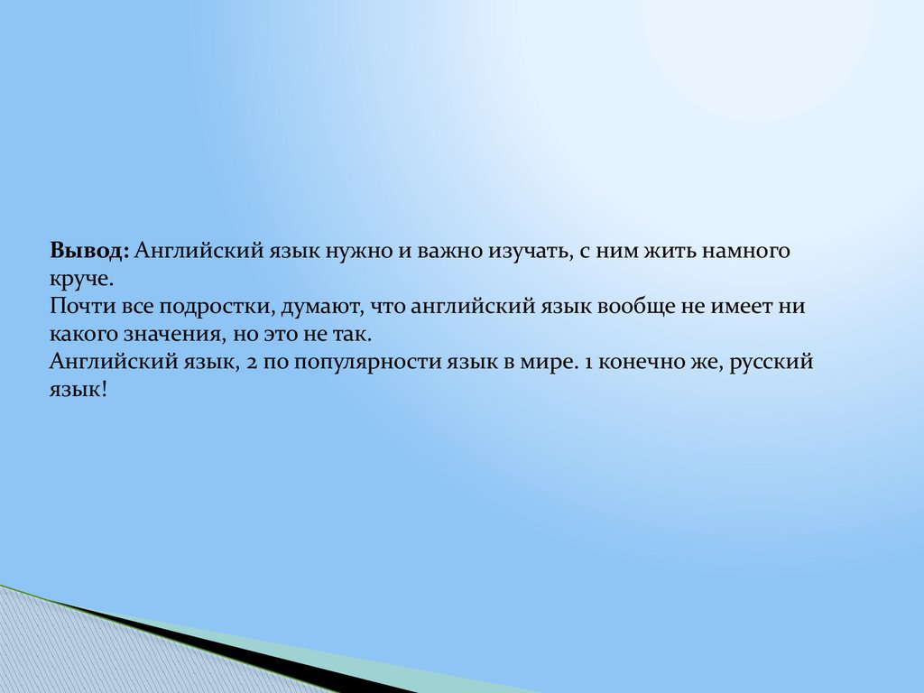 Вывод: Английский язык нужно и важно изучать, с ним жить намногокруче.