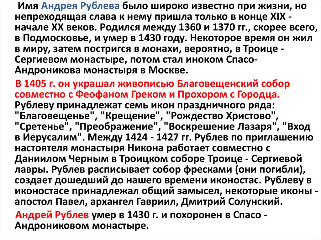 Имя Андрея Рублева было широко известно при жизни, нонепреходящая слава к нему пришла только в конце XIX начале XX веков. Родился между 1360 и 1370 гг., скорее всего,