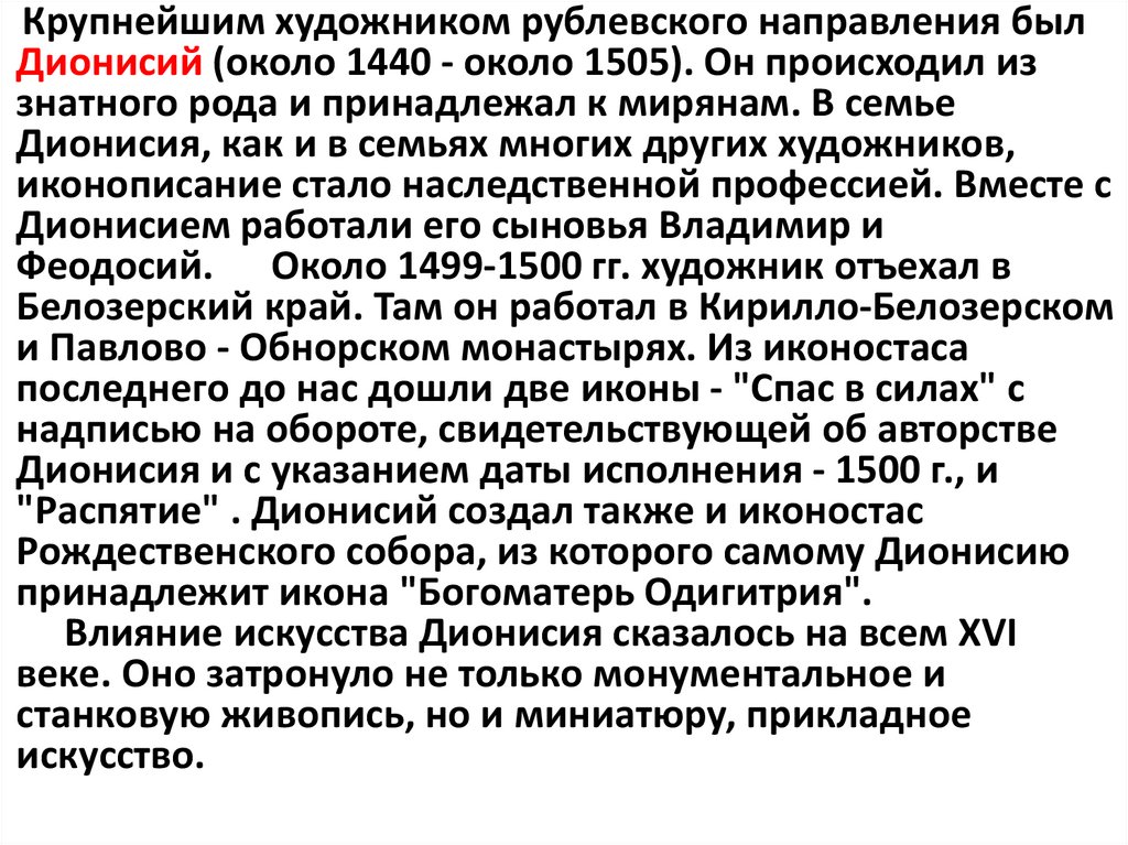 Крупнейшим художником рублевского направления былДионисий (около 1440 - около 1505). Он происходил из