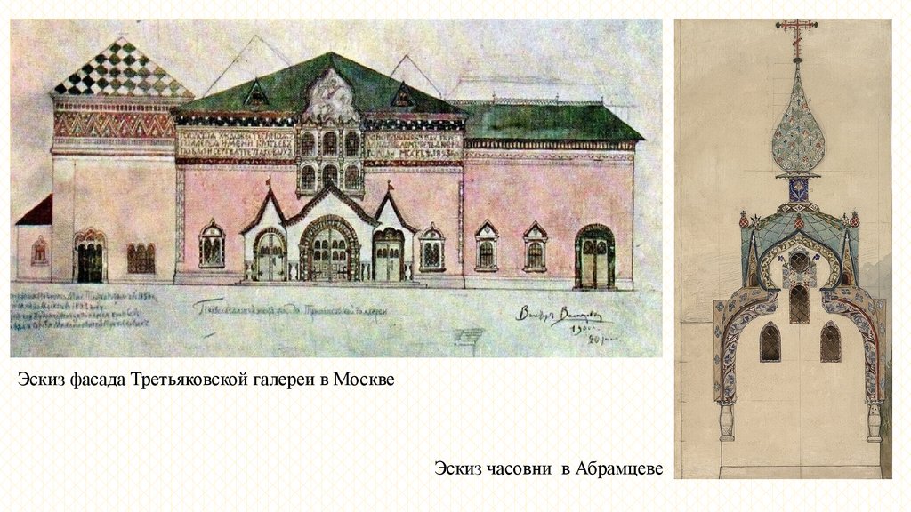 Эскиз фасада Третьяковской галереи в МосквеЭскиз часовни в Абрамцеве