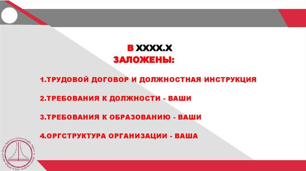 15. В ХХХХ.Х ЗАЛОЖЕНЫ: 1.ТРУДОВОЙ ДОГОВОР И ДОЛЖНОСТНАЯ ИНСТРУКЦИЯ 2.ТРЕБОВАНИЯ К ДОЛЖНОСТИ - ВАШИ 3.ТРЕБОВАНИЯ К ОБРАЗОВАНИЮ -