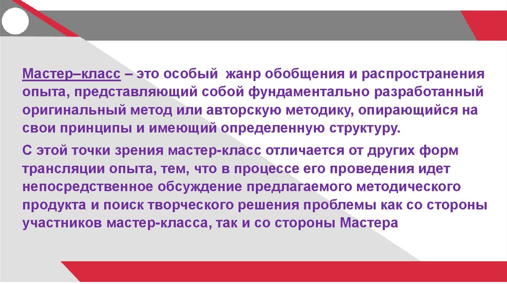 Мастер–класс – это особый жанр обобщения и распространенияопыта, представляющий собой фундаментально разработанный