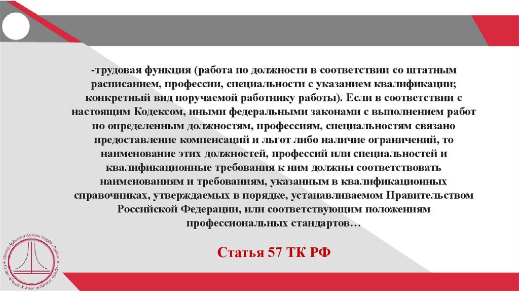 -трудовая функция (работа по должности в соответствии со штатнымрасписанием, профессии, специальности с указанием квалификации;