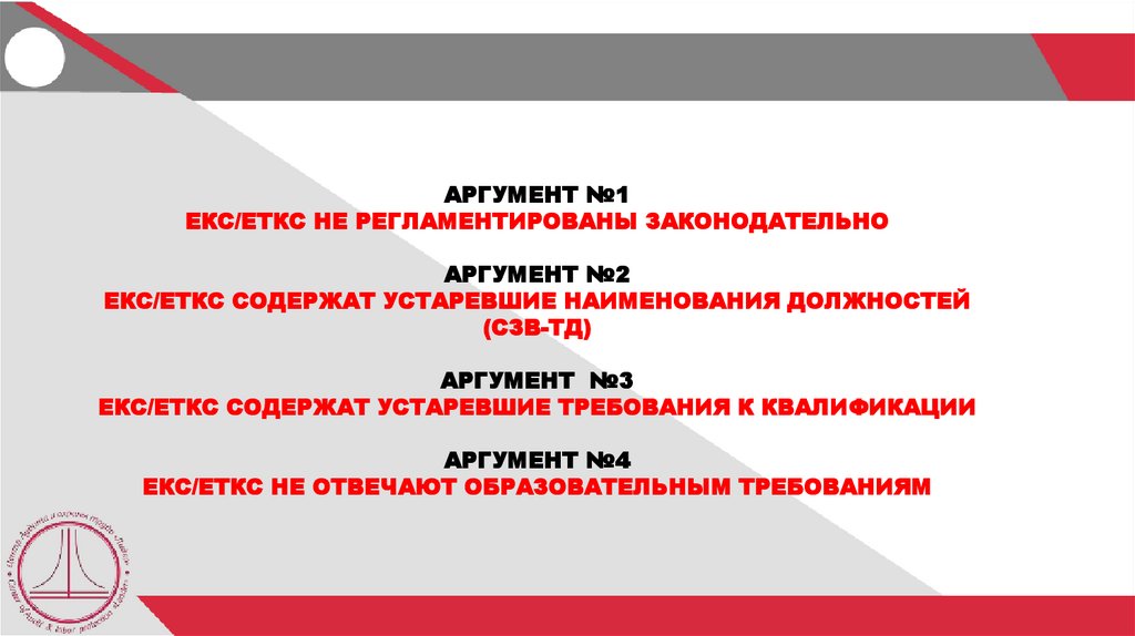 100. АРГУМЕНТ №1 ЕКС/ЕТКС НЕ РЕГЛАМЕНТИРОВАНЫ ЗАКОНОДАТЕЛЬНО АРГУМЕНТ №2 ЕКС/ЕТКС СОДЕРЖАТ УСТАРЕВШИЕ НАИМЕНОВАНИЯ ДОЛЖНОСТЕЙ