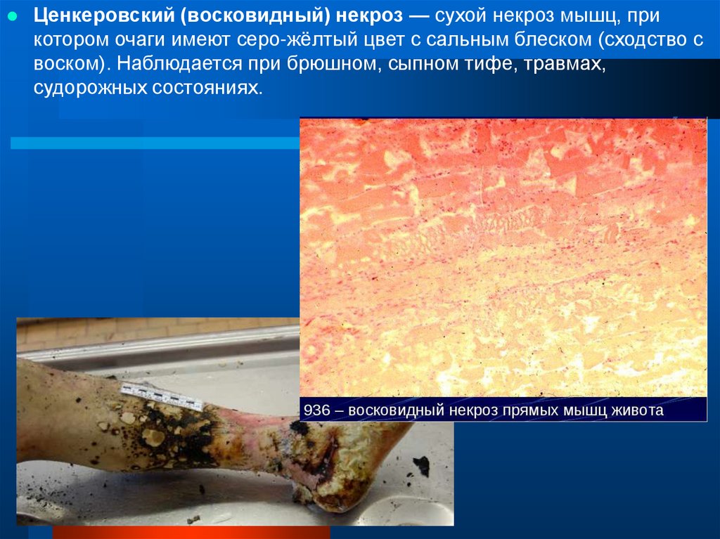 Ценкеровский (восковидный) некроз — сухой некроз мышц, прикотором очаги имеют серо-жёлтый цвет с сальным блеском (сходство с