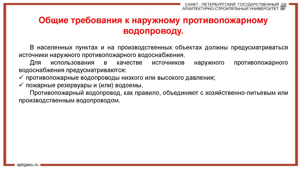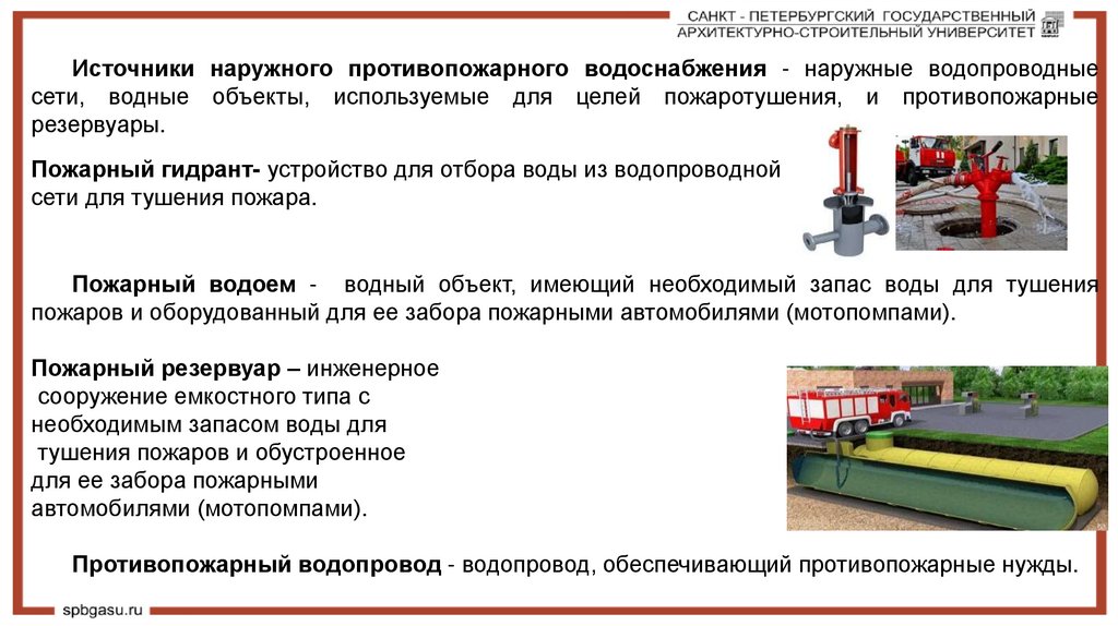 Источники наружного противопожарного водоснабжения - наружные водопроводныесети, водные объекты, используемые для целей пожаротушения, и противопожарные