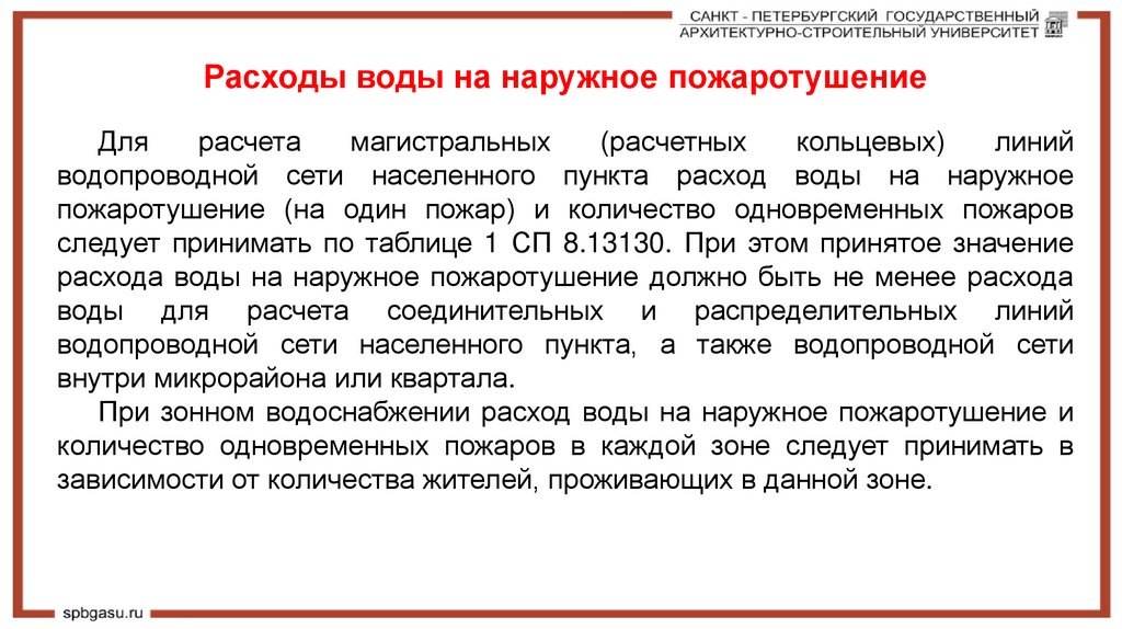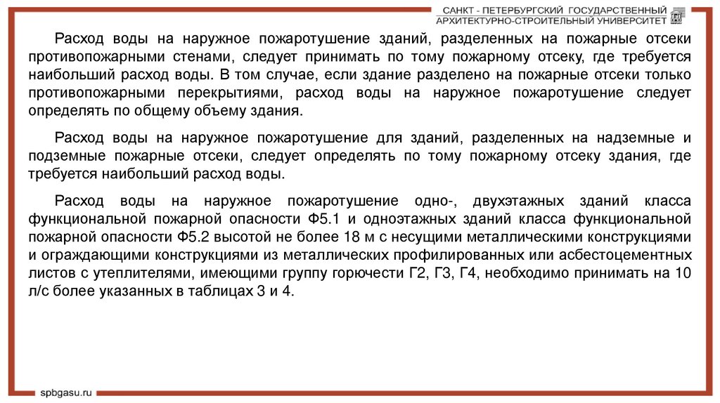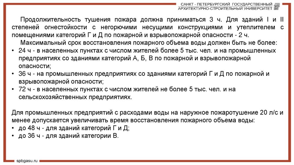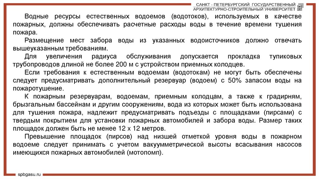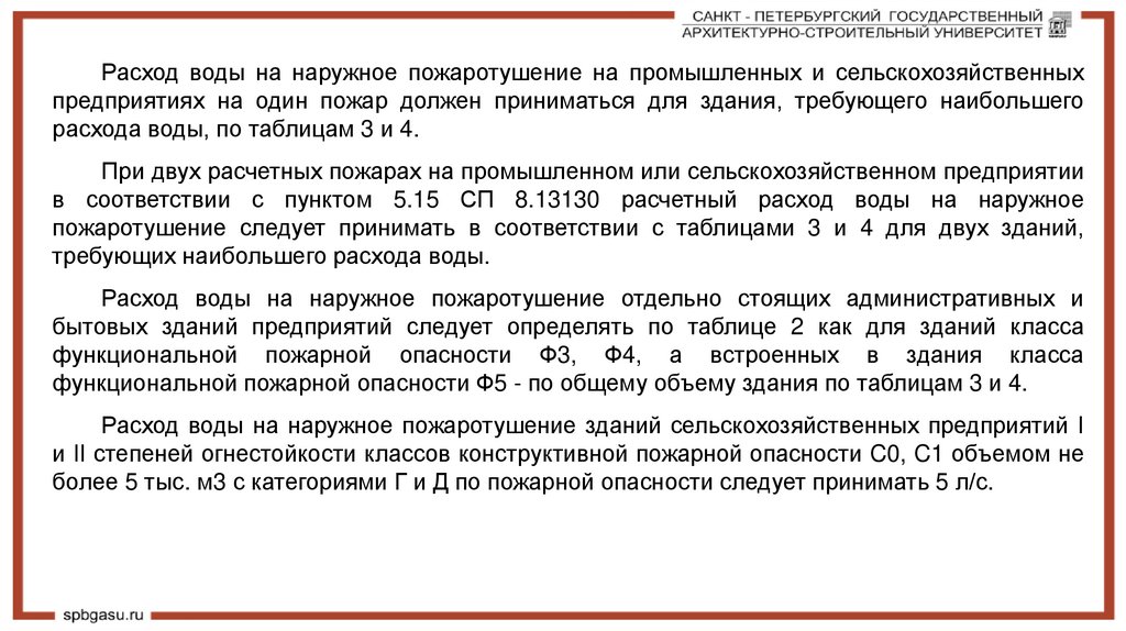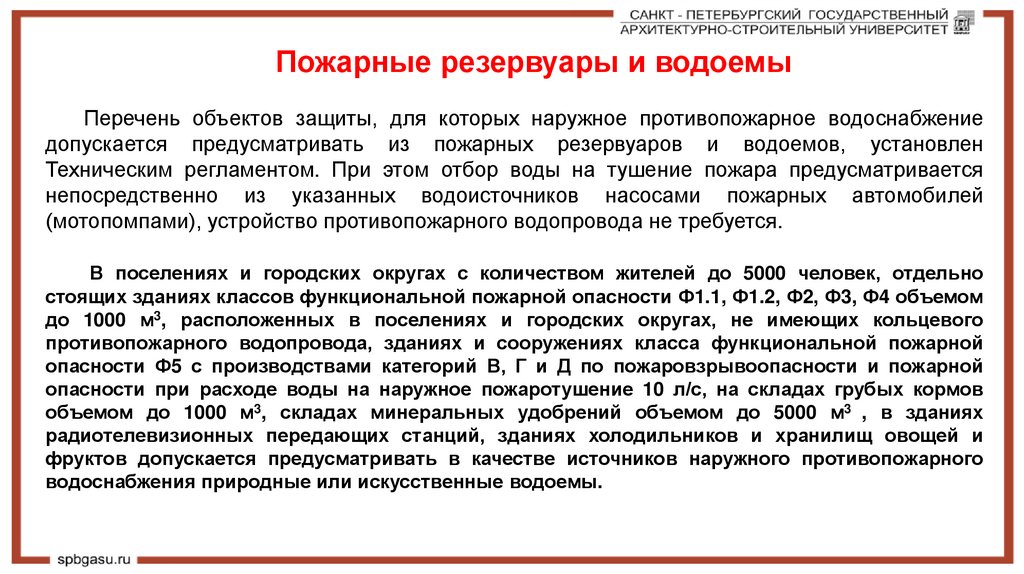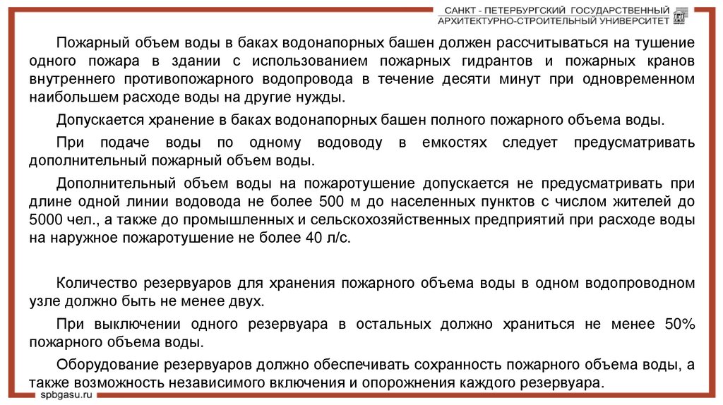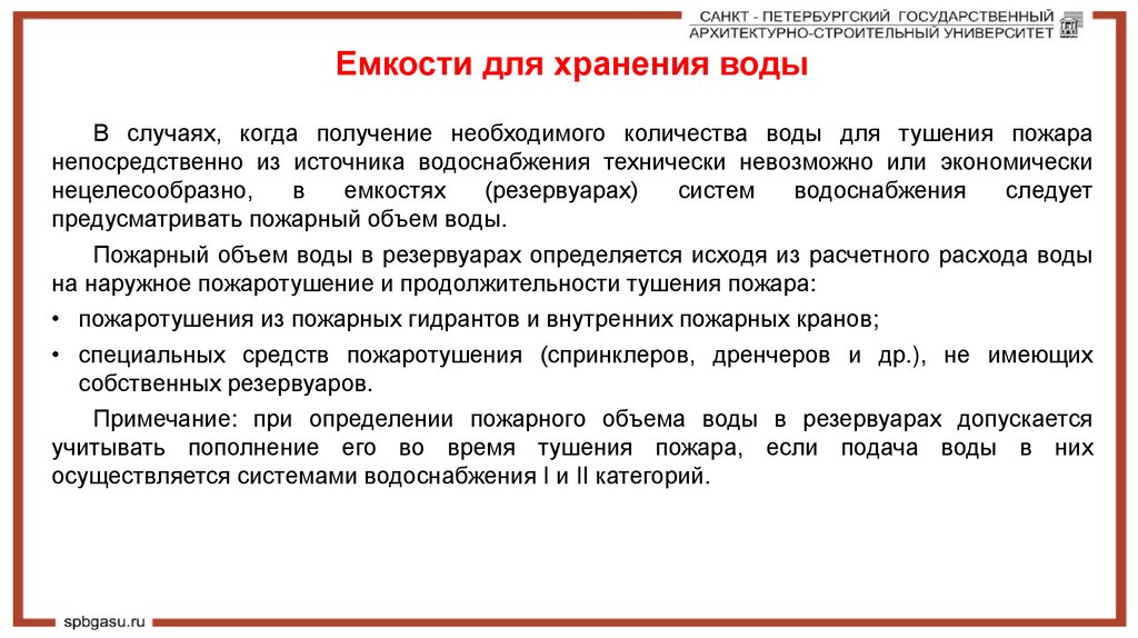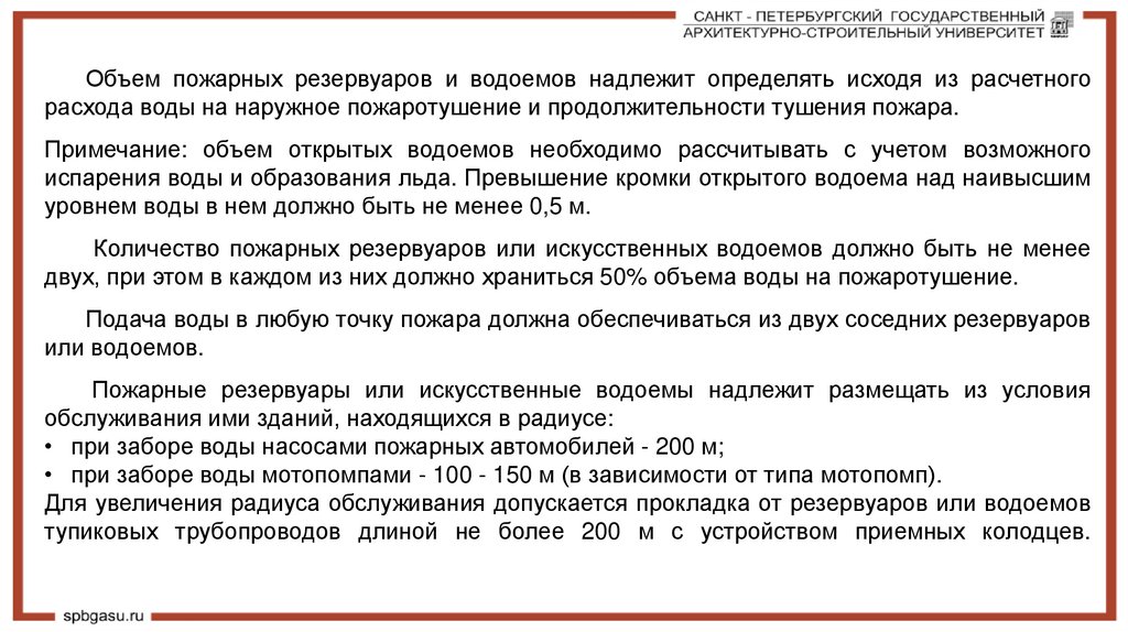 Объем пожарных резервуаров и водоемов надлежит определять исходя из расчетногорасхода воды на наружное пожаротушение и продолжительности тушения пожара.