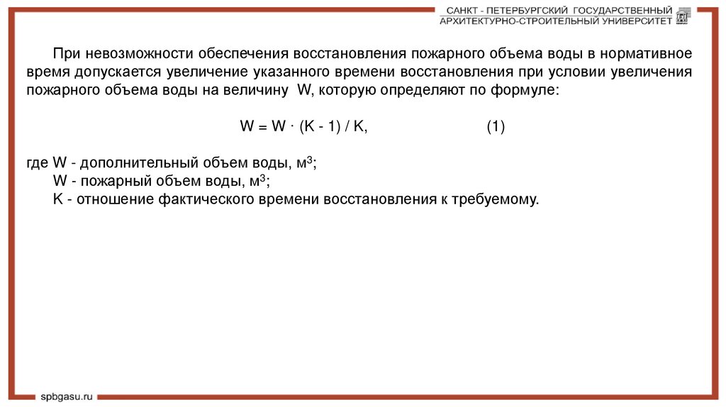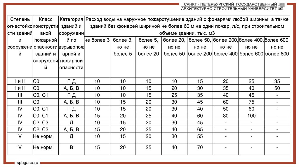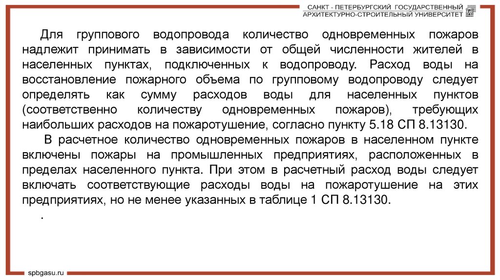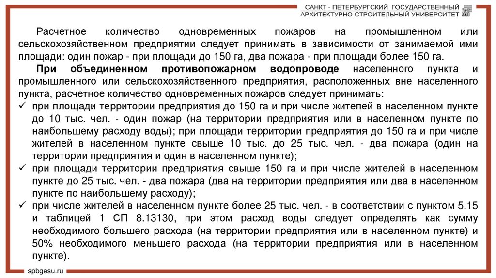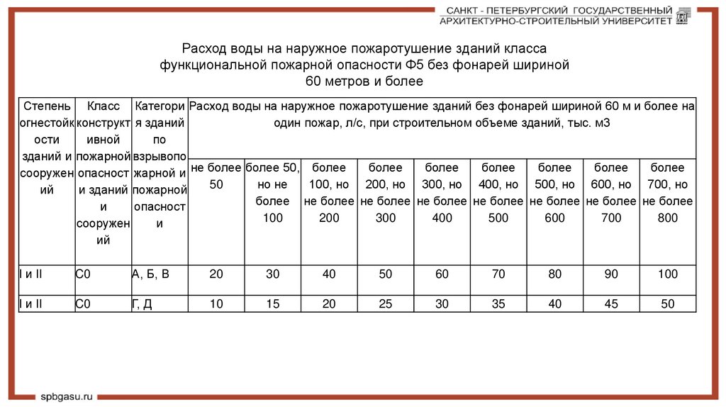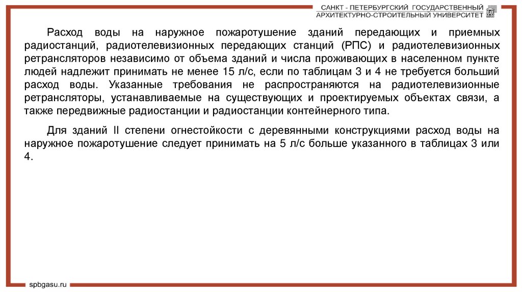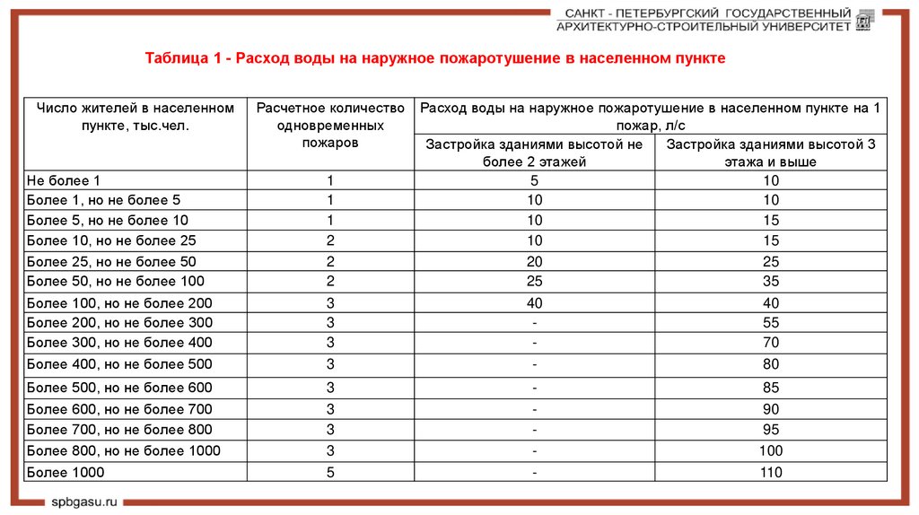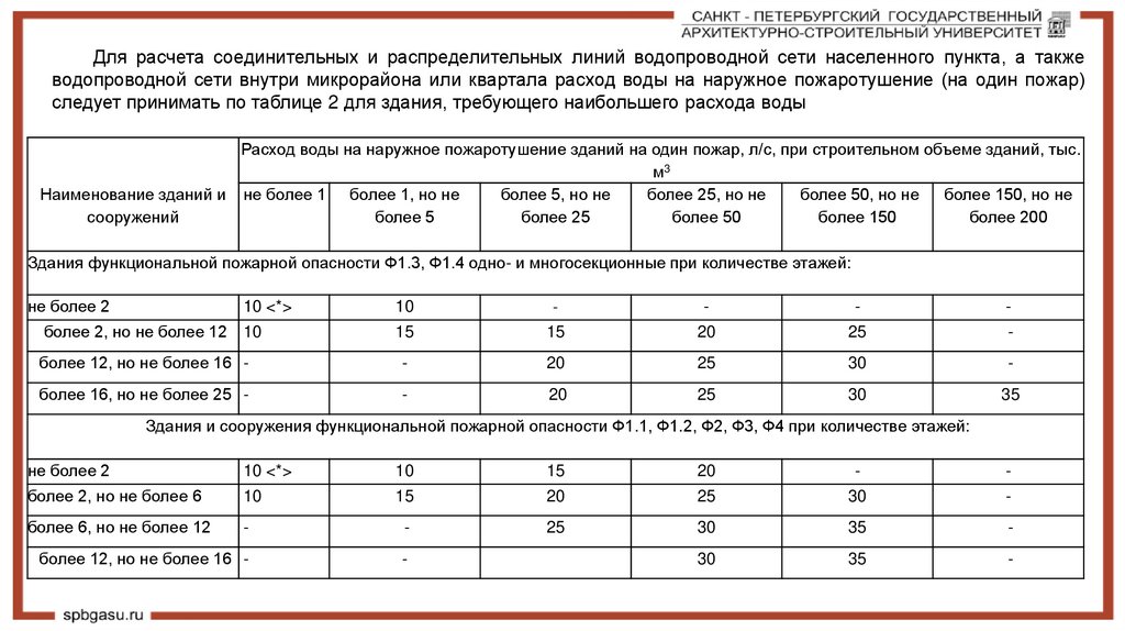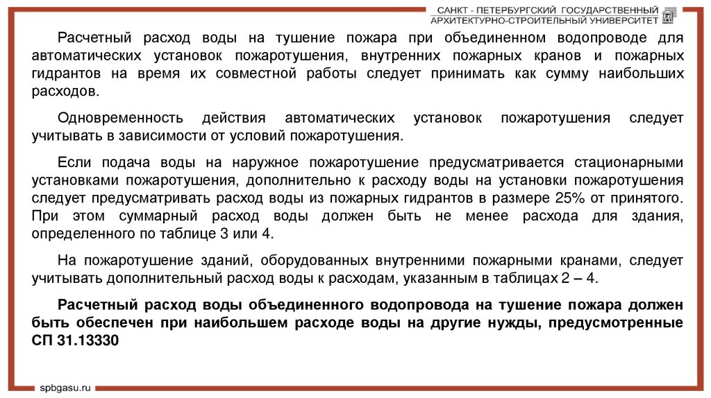 Объем пожарных резервуаров и водоемов надлежит определять исходя из расчетногорасхода воды на наружное пожаротушение и продолжительности тушения пожара.