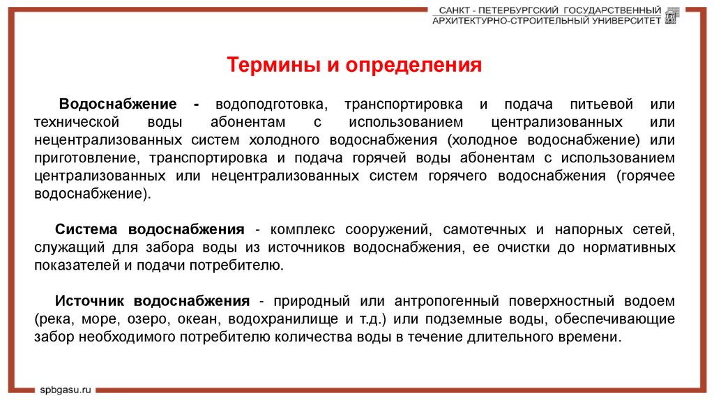 Термины и определенияВодоснабжение - водоподготовка, транспортировка и подача питьевой или