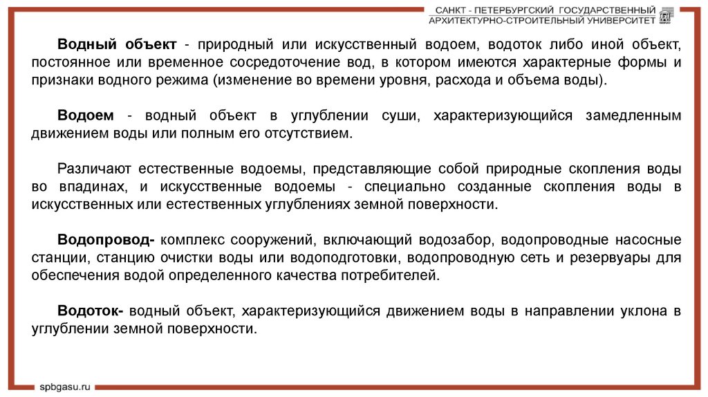 Водный объект - природный или искусственный водоем, водоток либо иной объект,постоянное или временное сосредоточение вод, в котором имеются характерные формы и
