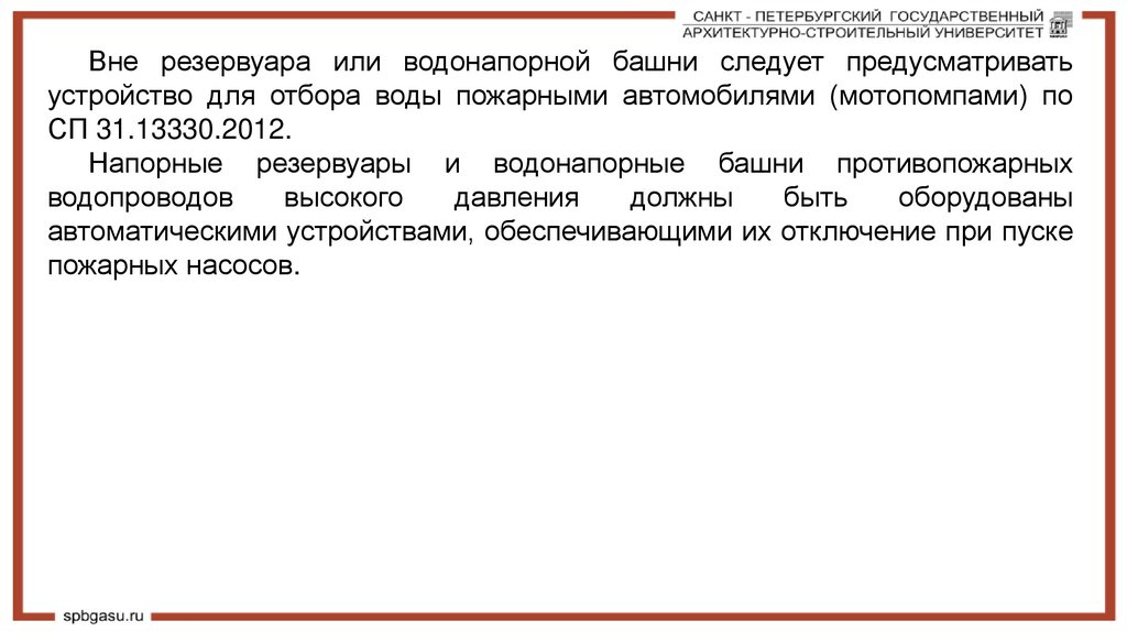 Пожарные резервуары должны быть оборудованы устройствами для отбора воды