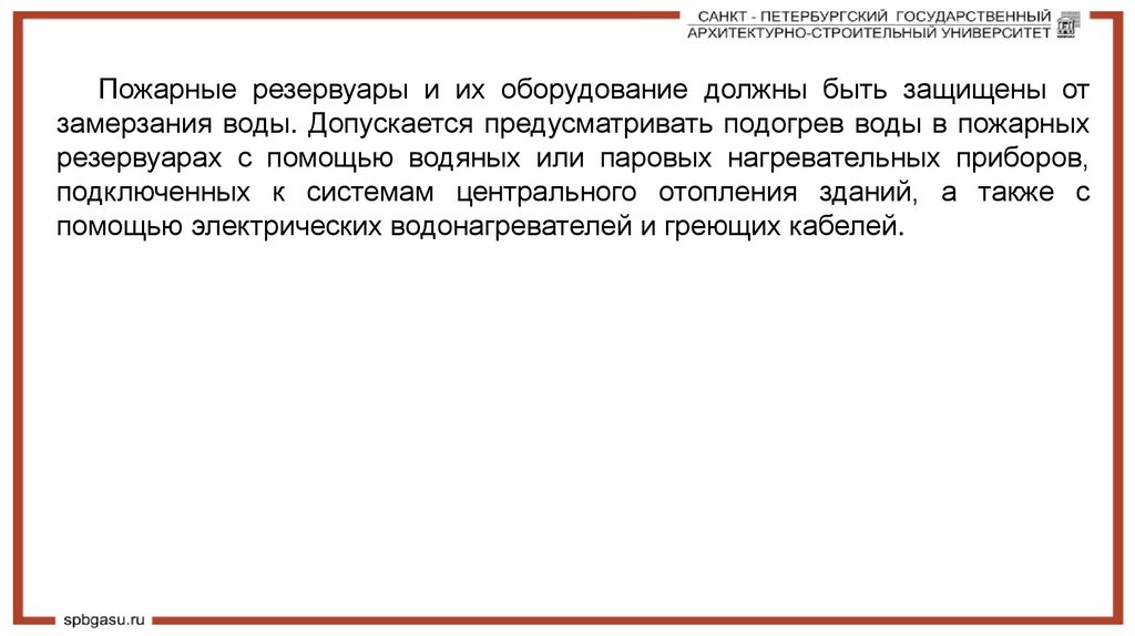 Пожарные резервуары и их оборудование должны быть защищены отзамерзания воды. Допускается предусматривать подогрев воды в пожарных