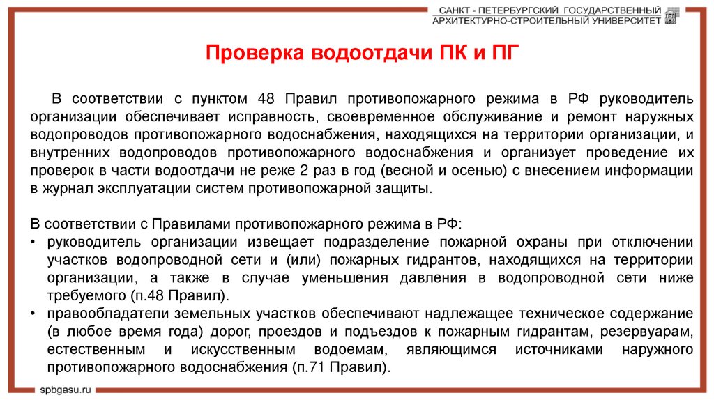 Проверка водоотдачи ПК и ПГВ соответствии с пунктом 48 Правил противопожарного режима в РФ руководитель