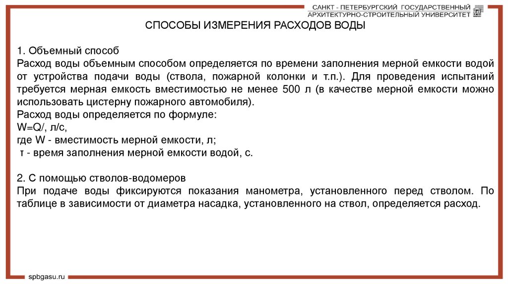 СПОСОБЫ ИЗМЕРЕНИЯ РАСХОДОВ ВОДЫ1. Объемный способ