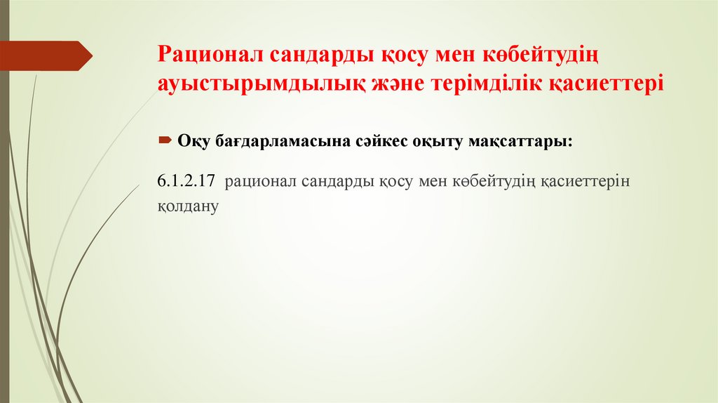 Оқу бағдарламасына сәйкес оқыту мақсаттары:6.1.2.17 рационал сандарды қосу мен көбейтудің қасиеттерін