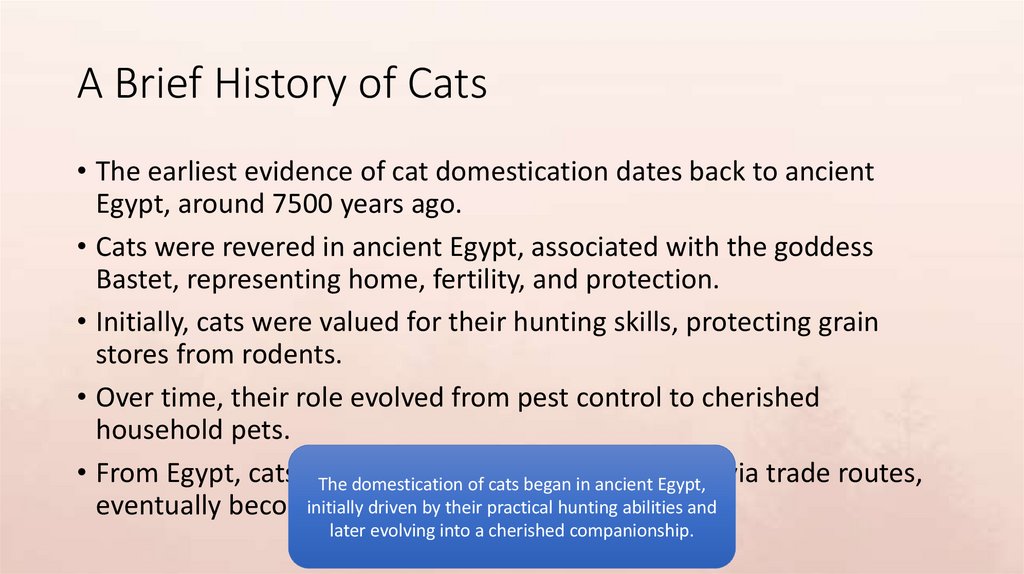 A Brief History of Cats• The earliest evidence of cat domestication dates back to ancient