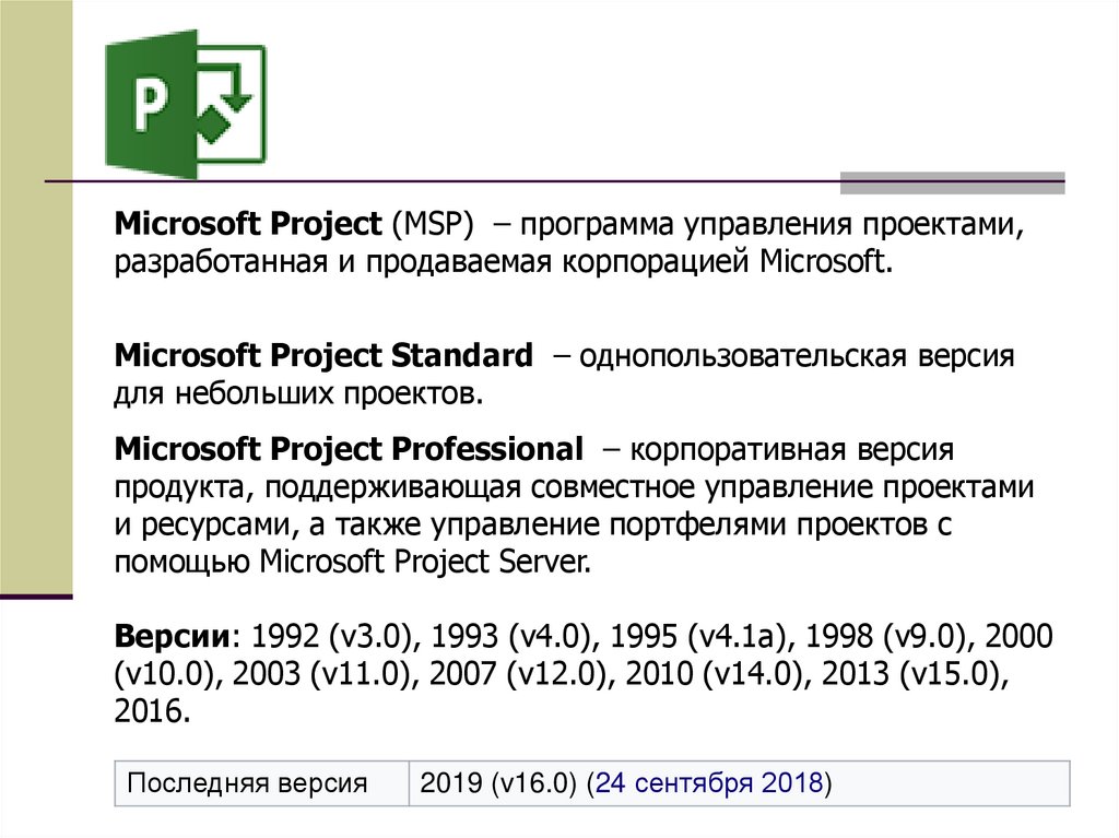 Microsoft Project (MSP) – программа управления проектами,разработанная и продаваемая корпорацией Microsoft.