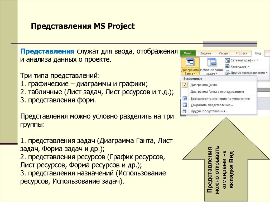 На вкладке Вид можно выбирать различные представления,доступные в приложении Project 2010, а также настраивать