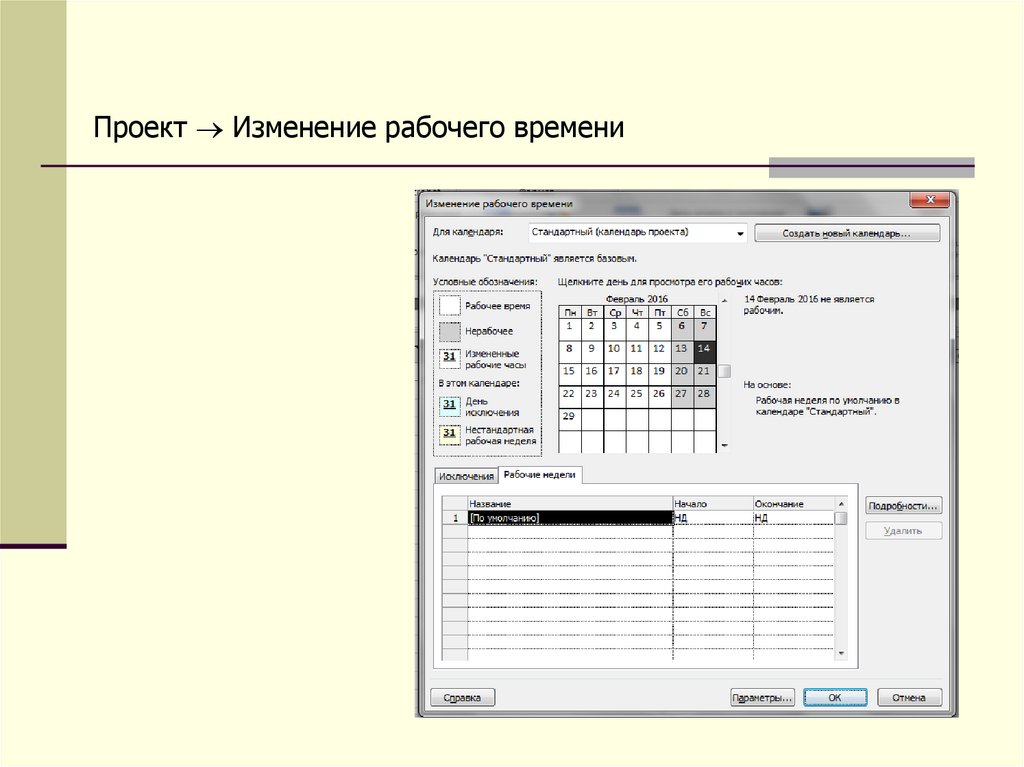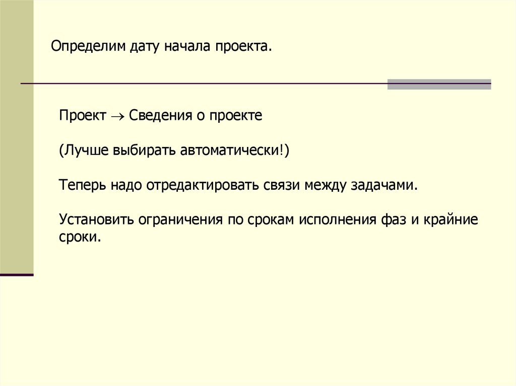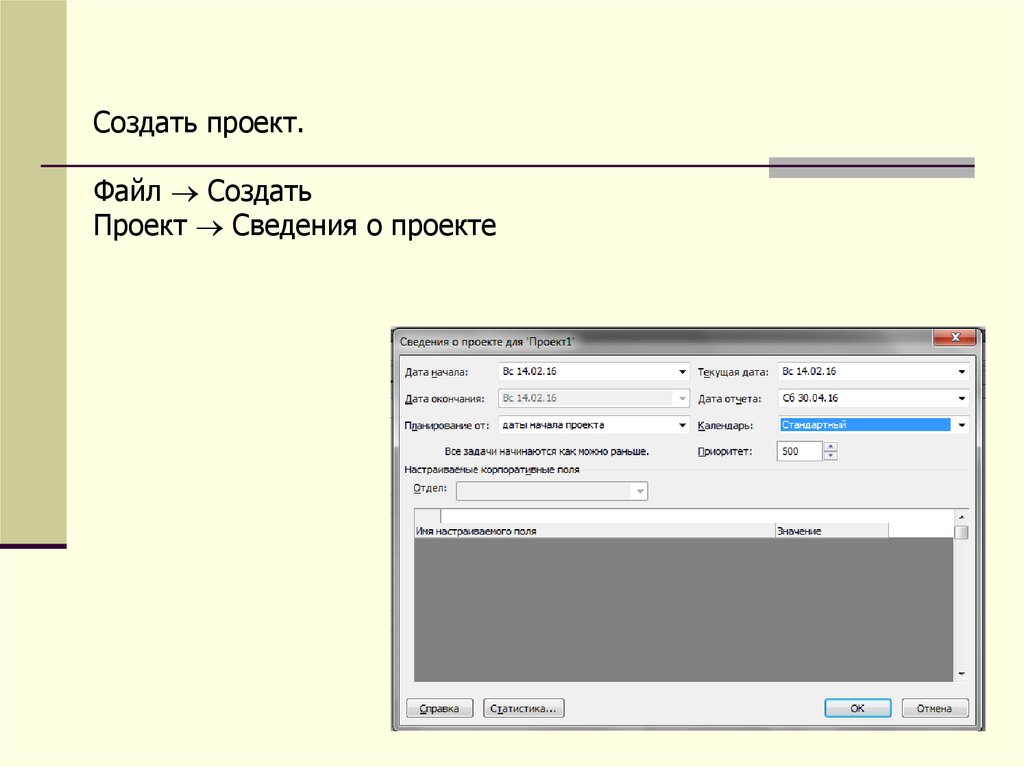 Определим дату начала проекта.Проект Сведения о проекте
