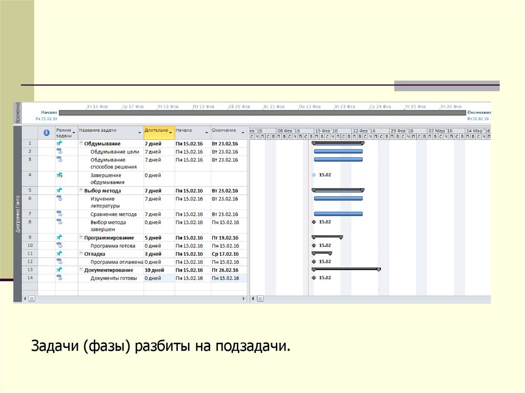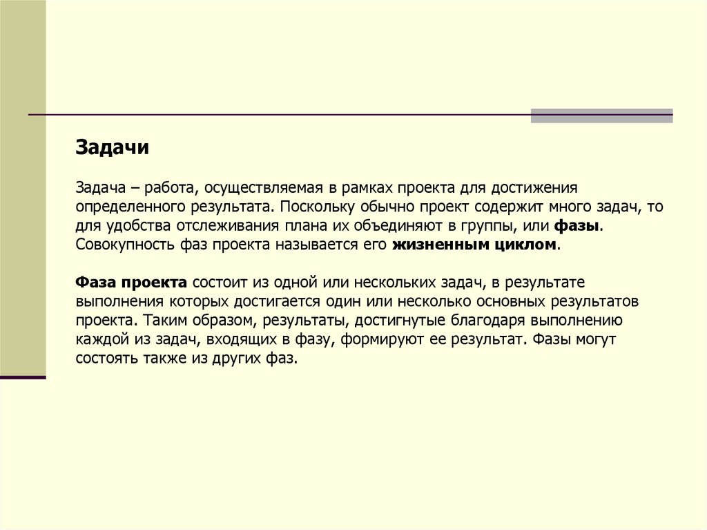 Фаза проекта состоит из одной или нескольких задач, в результате