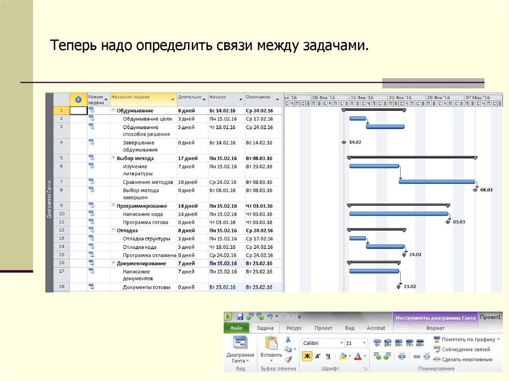 Теперь надо определить связи между задачами.29.