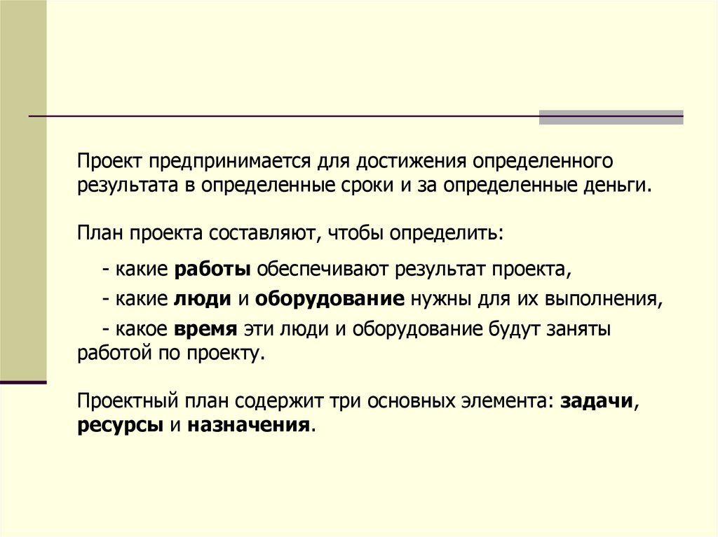Проектный план содержит три основных элемента: задачи,
