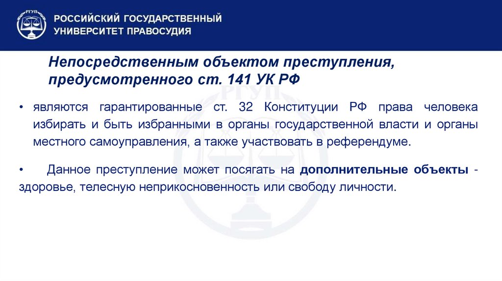 Непосредственным объектом преступления,предусмотренного ст. 141 УК РФ