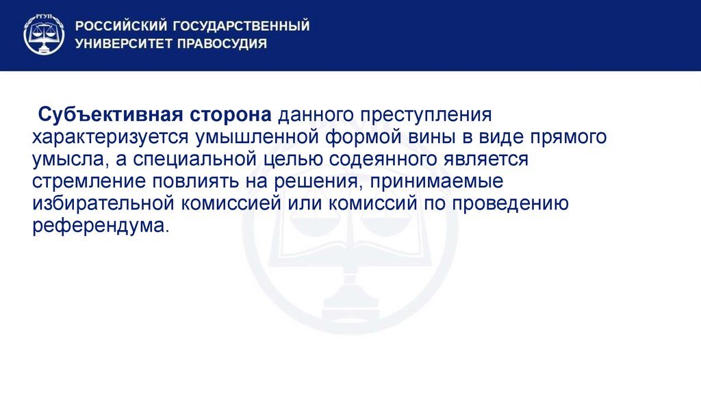 Субъективная сторона данного преступленияхарактеризуется умышленной формой вины в виде прямого