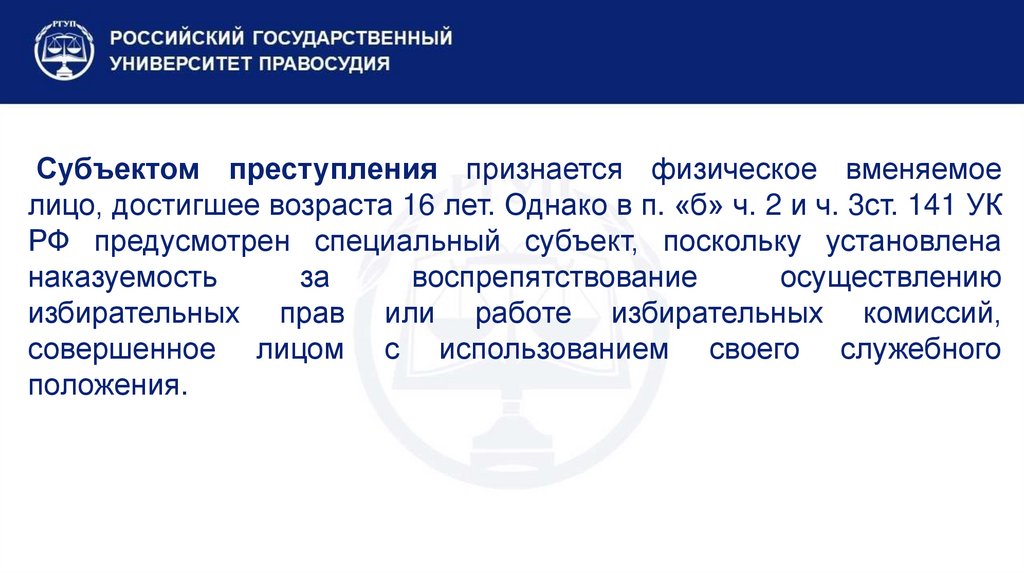 Субъектом преступления признается физическое вменяемоелицо, достигшее возраста 16 лет. Однако в п. «б» ч. 2 и ч. 3ст. 141 УК