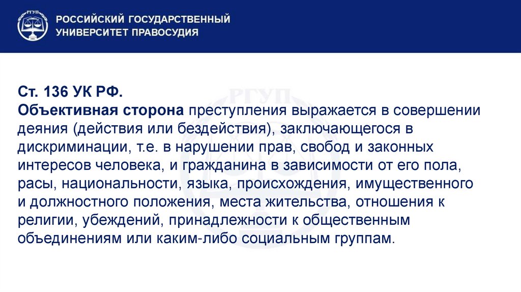 Ст. 136 УК РФ.Объективная сторона преступления выражается в совершении