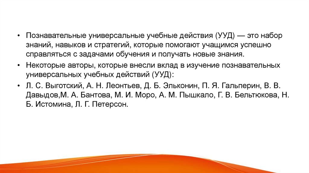 • Познавательные универсальные учебные действия (УУД) — это наборзнаний, навыков и стратегий, которые помогают учащимся успешно