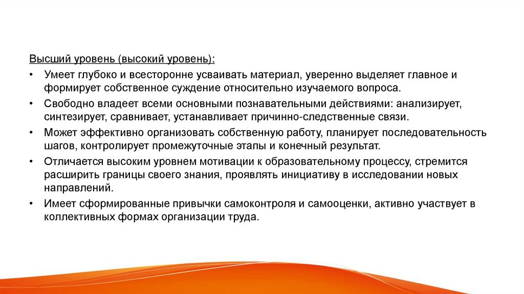 Высший уровень (высокий уровень):• Умеет глубоко и всесторонне усваивать материал, уверенно выделяет главное и