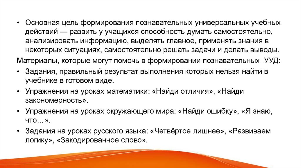 • Основная цель формирования познавательных универсальных учебныхдействий — развить у учащихся способность думать самостоятельно,