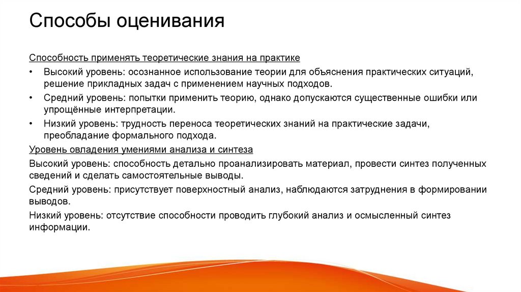• Высокий уровень: осознанное использование теории для объяснения практических ситуаций,