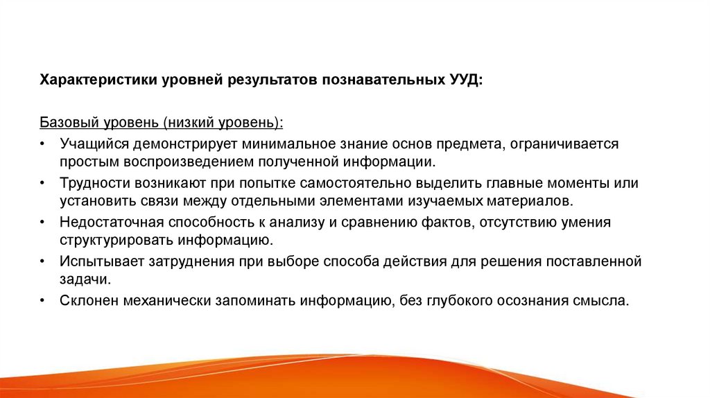 Характеристики уровней результатов познавательных УУД:Базовый уровень (низкий уровень):