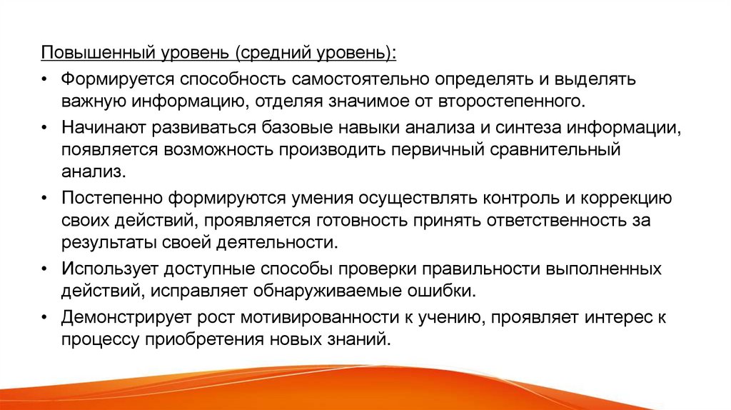 Повышенный уровень (средний уровень):• Формируется способность самостоятельно определять и выделять