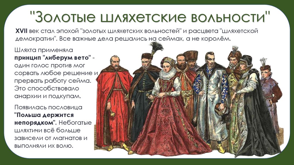 "Золотые вольности" шляхты привели к анархии и ослаблению центральной власти.